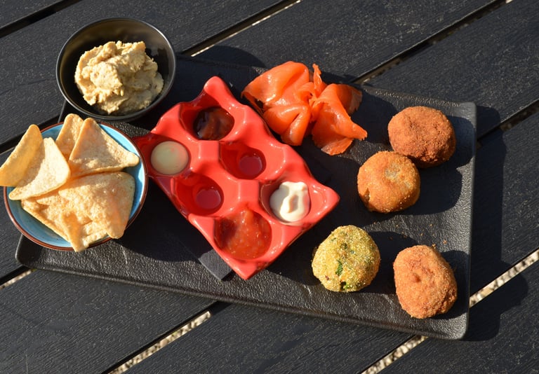 4 polpette miste (tonno, verdure, cacio e pepe e bolognese) servite con 3 differenti salse. Hummus di ceci e trota salmonata con maionese al rafano con crostini croccanti.